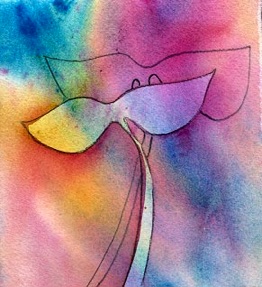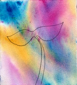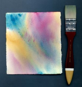 Thoroughly wet the surface of your paper with a 1" flat brush and water. The paper should appear shiny. Apply brush loads of each colour separately allowing them to mix on the wet paper. Spatter, drip and pour! Lift and tilt the paper to encourage the pigments to flow and mingle. Leave as little or as much white as you wish. Don't fuss over the wash for too long; this is just to get you started. When you are pleased with this first application of colour set the painting on a board to dry completely.